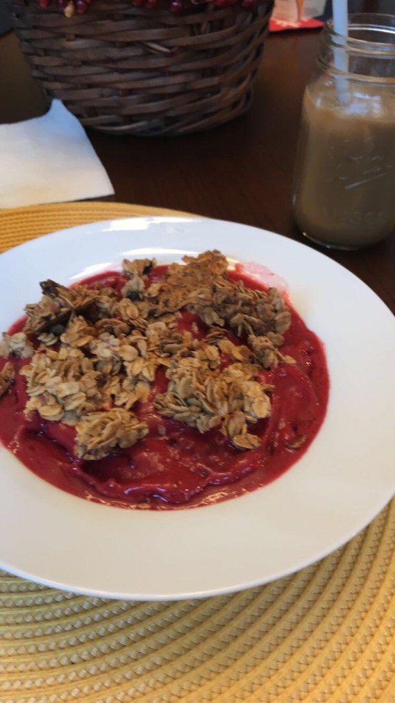This can be eaten by itself (because it’s delicious!), with a smoothie bowl or with yogurt. If you want to make this with a smoothie bowl, just use your favorite smoothie recipe but reduce the liquid in the smoothie to make it thicker.